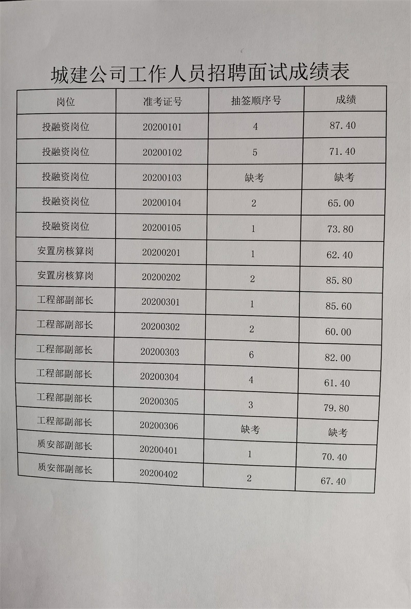 宜昌市点军城乡建设开发有限公司2020年公开招聘工作人员面试于2020年12月12日结束,现将面试成绩公示如下,如有疑问请于工作日拨打公司电话咨询。电话为0717-6622026,公示期5天。